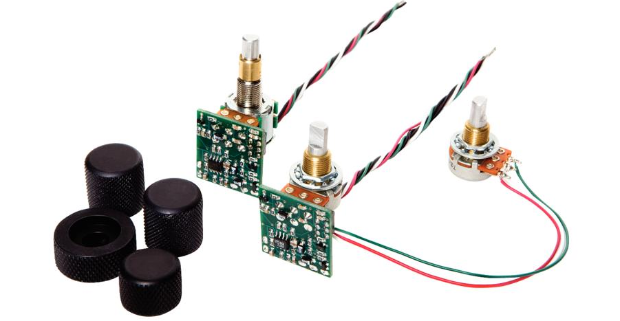• Zawiera wszystkie niezbędne elementy: potencjometry z układami, klips do baterii, gniazdo stereo, czarne gałki