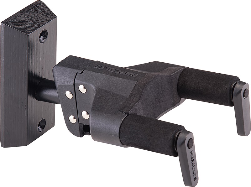 HERCULES GSP38WBK PLUS obraca się automatycznie, aby dopasować się pionowo i bezpiecznie do różnych kształtów gitar lub basów. Posiada drewnianą podstawę z czarnym wykończeniem do użytku domowego lub studyjnego.