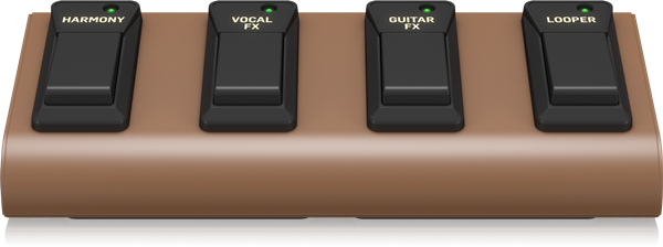 Looping, przetwarzanie wokalu i efekty gitarowe mogą być kontrolowane przez wytrzymały 4-przyciskowy przełącznik nożny dołączony do Harmony V100. Domyślne mapowanie przycisków przełącznika nożnego do efektów jest zapewnione, ale ich konfiguracja jest łatwa i szybka, jeśli chcesz na przykład szybkiego dostęp uprzełącznikiem nożnym do tunera.