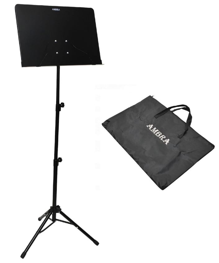 Ambra AM-06 to solidny, pełnowymiarowy pulpit orkiestrowy, który zapewnia stabilność nawet w trudnych warunkach, takich jak występy plenerowe. Dzięki regulacji wysokości do 140 cm i możliwości dostosowania kąta nachylenia, pulpit jest wygodny zarówno do ćwiczeń domowych, jak i dla profesjonalnych muzyków w orkiestrach i zespołach. Wyposażony w wąsy zabezpieczające nuty przed odfrunięciem, antypoślizgowe końcówki na nogach oraz solidne pokrętła regulacyjne, gwarantuje bezpieczne użytkowanie. Pulpit o wymiarach 49 cm x 33 cm jest wystarczająco duży, aby pomieścić większe partytury, a nylonowa torba ułatwia jego transport.