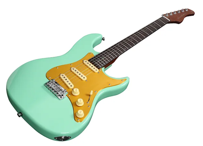 Co do modelu Sire Larry Carlton S7 Vintage to największą zmianą jest wprowadzenie podstrunnicy z palisandru. Do tej pory gitary te posiadały podstrunnice z klonu prażonego i wiem, że wielu gitarzystów odpuściło zakup tylko ze względu na fakt braku właśnie takiej opcji jak palisander. Teraz nie mamy wymówki bo sama gitara jest niesamowicie grywalna i bardzo równa brzmieniowo. Dzięki zastosowaniu palisandru jako materiału na podstrunnicę, możemy odczuć mniej świszczącej góry, jest to ważne szczególnie w sytuacji gdy gramy na gitarze typowo startowej z przetwornikami w układzie trzech przetworników single coil. Korpus zbudowano z olchy, która jest drewnem bardzo równym i „gładkim” w alikwotach. Zastosowano tutaj most jakim jest dwupunktowe tremolo ze stalowym blokiem i siodełkami z walcowanej na zimno stali. Przełącznik działa jak w serii S3 czyli w pięciu pozycjach. Szyjka zbudowana z klonu pieczonego o kształcie bardzo zbliżonym do tańszego modelu posiada naklejoną podstrunnicę z pięknego ciemnego palisandru a nabito na nią dwadzieścia dwa progi. Są to progi duże i doskonale wyprowadzone. W gitarze tej znajdziemy również mała różnicę względem tańszego instrumentu jaką jest zestaw sześciu blokowanych kluczy. To nie wszystko, dlatego że klucze te nie tylko są blokowane, ale i posiadają dwie różne wysokości trzpieni. Cztery z nich od strony cieńszych strun są niskie a dwa wysokie. Ktoś może zapytać”ale po co”. Odpowiadam zatem. Takie rozwiązanie pozwala na ułożenie struny po wyjściu z siodła w odpowiednim kącie. Dzięki temu struna nie wypadnie z siodełka a nie będzie tu potrzebny żaden docisk strun na główce. Ma to spory wpływ na stabilność stroju przy używaniu mostka tremolo i warto mieć to z tyłu głowy kupując instrument ,bo może pomóc nam to w podjęciu decyzji zakupu.