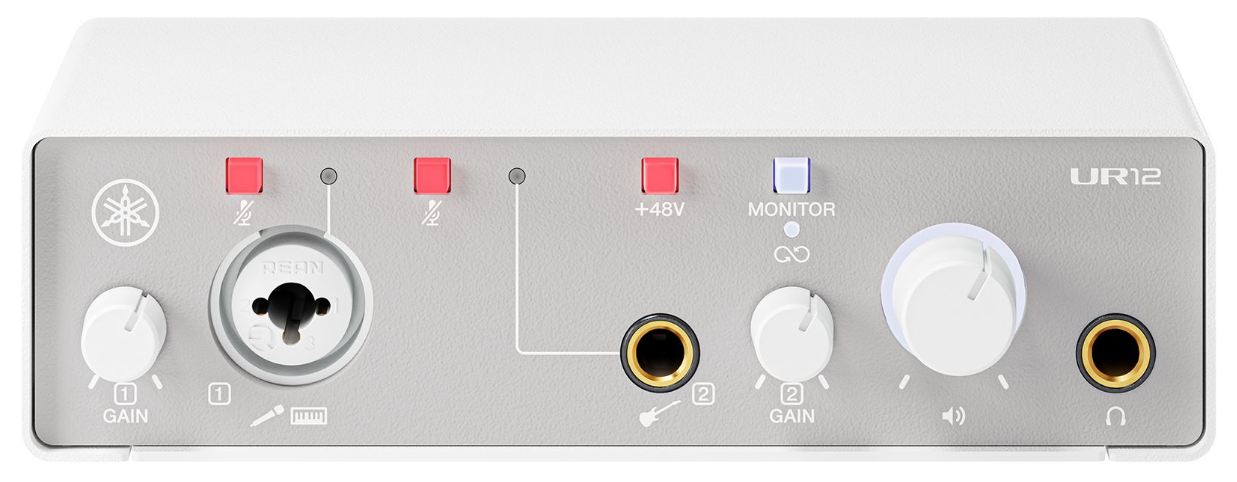 Interfejs użytkownika: Yamaha UR12MK3 W został wyposażony w intuicyjny i prosty w obsłudze panel sterowania, który umożliwia pełną kontrolę nad nagrywaniem i odsłuchem. Znajdują się na nim pokrętło Input Gain do regulacji poziomu sygnału wejściowego, przycisk Mute do szybkiego wyciszania wejść oraz przycisk +48 V Phantom Power do obsługi mikrofonów pojemnościowych. Przełącznik Monitor umożliwia łatwe sterowanie sygnałem odsłuchowym, a pokrętło głośności Main/Headphones pozwala na precyzyjne dopasowanie poziomu odsłuchu w słuchawkach lub monitorach studyjnych.